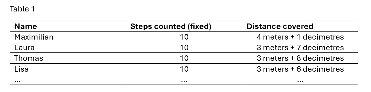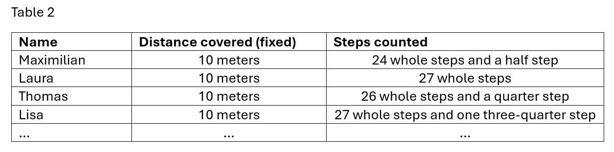 It would be just as conceivable to fix the distance and then count the steps required for each individual child. If fractions have already been dealt with, then half steps and possibly quarter steps can also be included.