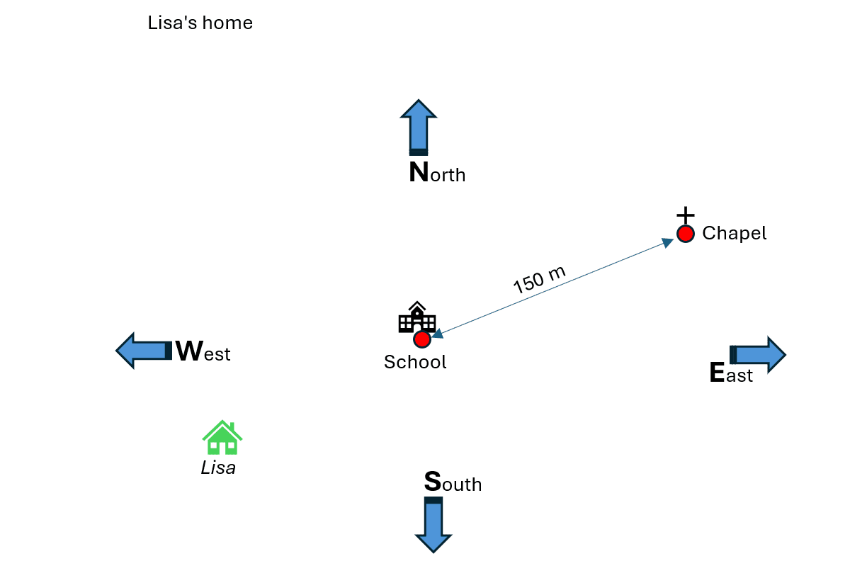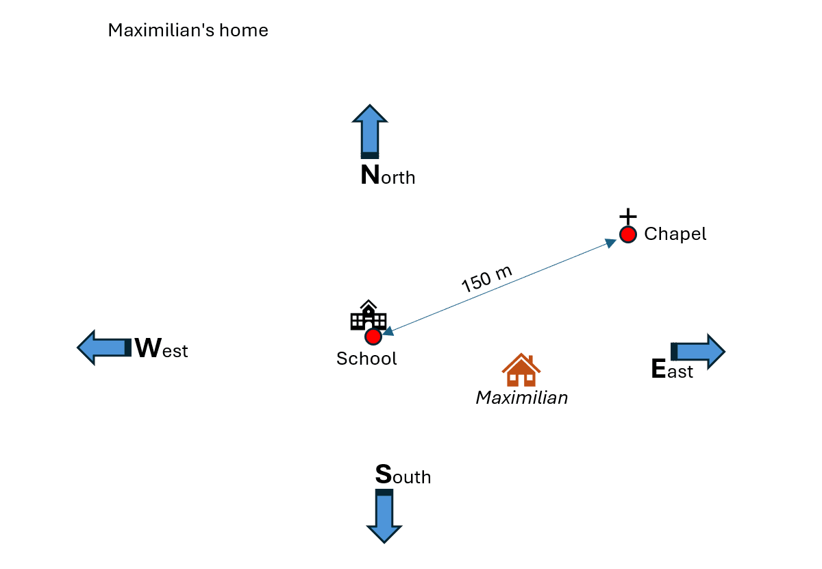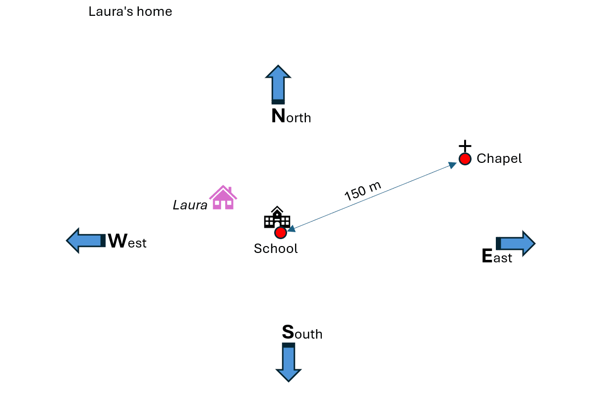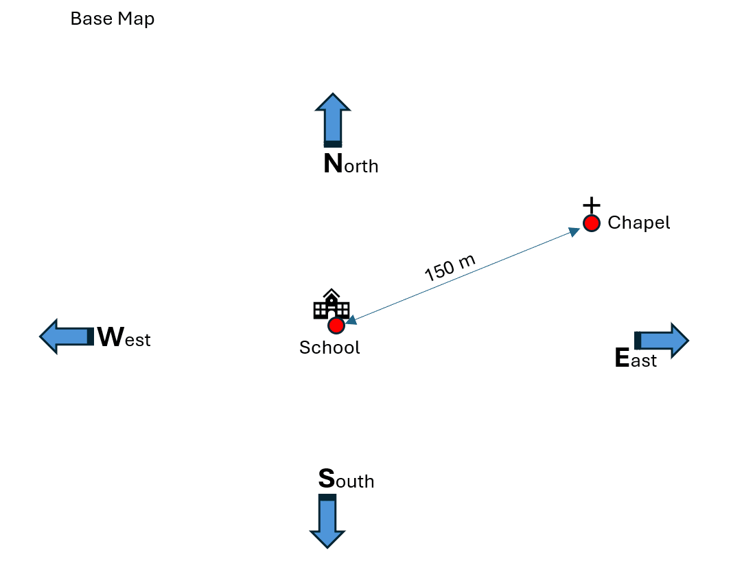 To do this, find a building close to the school location and use the pedometer to measure the distance between this building and the school location. The school building (reference point) and the neighbouring building are now drawn on a base map. The distance between the buildings is also marked using a suitable scale. For orientation purposes, the compass directions are also drawn on this first base map.