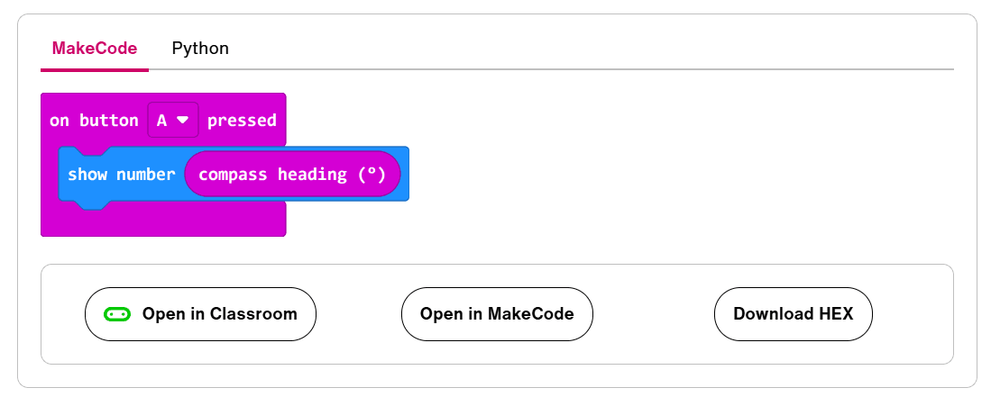 When you press the button A input, the micro:bit takes a reading from the compass sensor and shows the device’s numerical compass bearing on the LED display output. Point the micro:bit North and you should see a reading of 0 degrees.