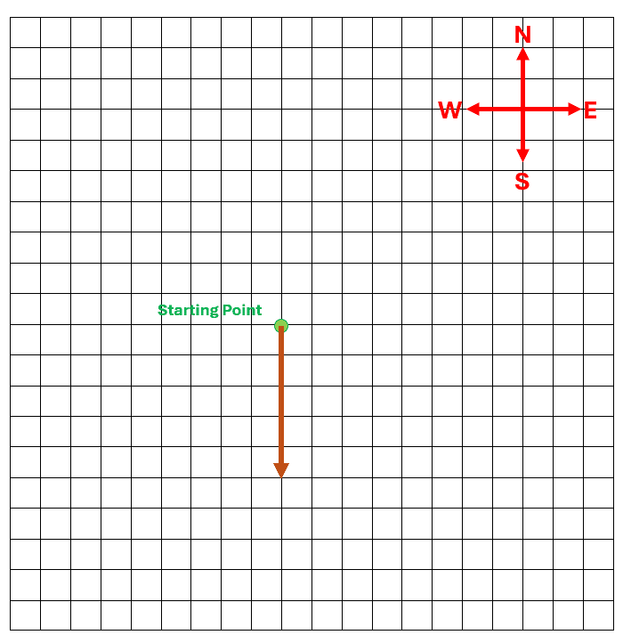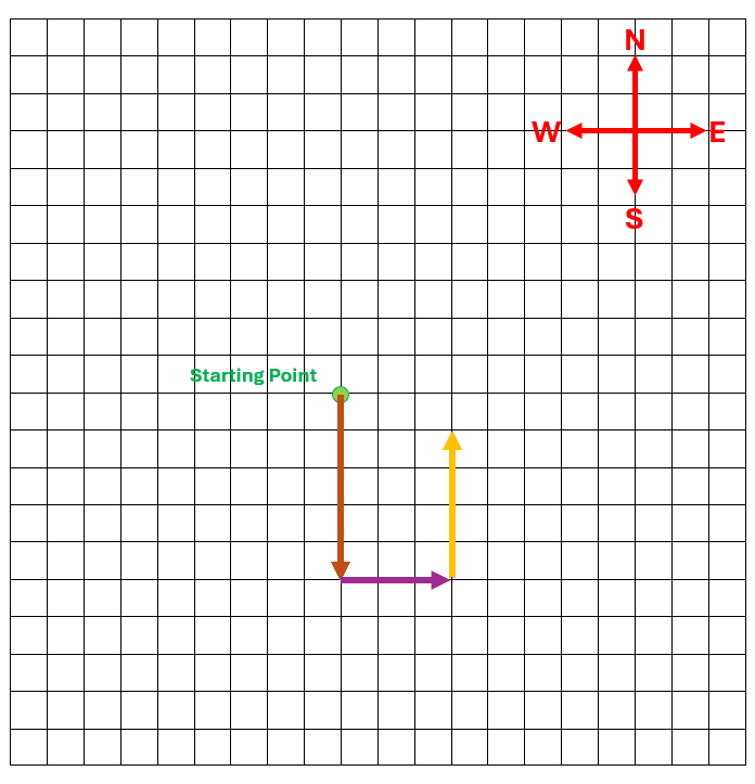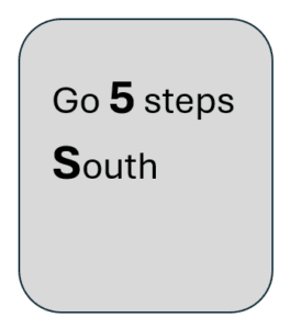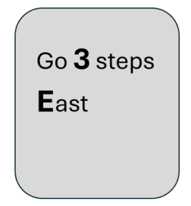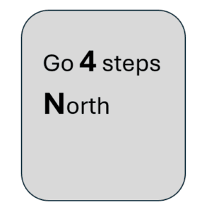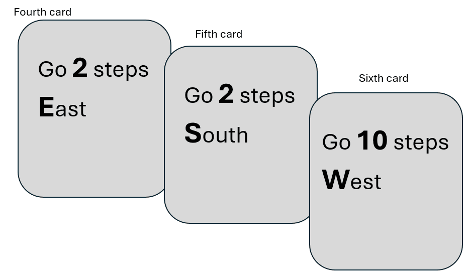 You also need to prepare simple instruction cards that indicate how many steps you should take in a certain direction. In this scale, a ‘step’ is exactly as long as the edge length of a little square. For example, a simple instruction card could look like this:
