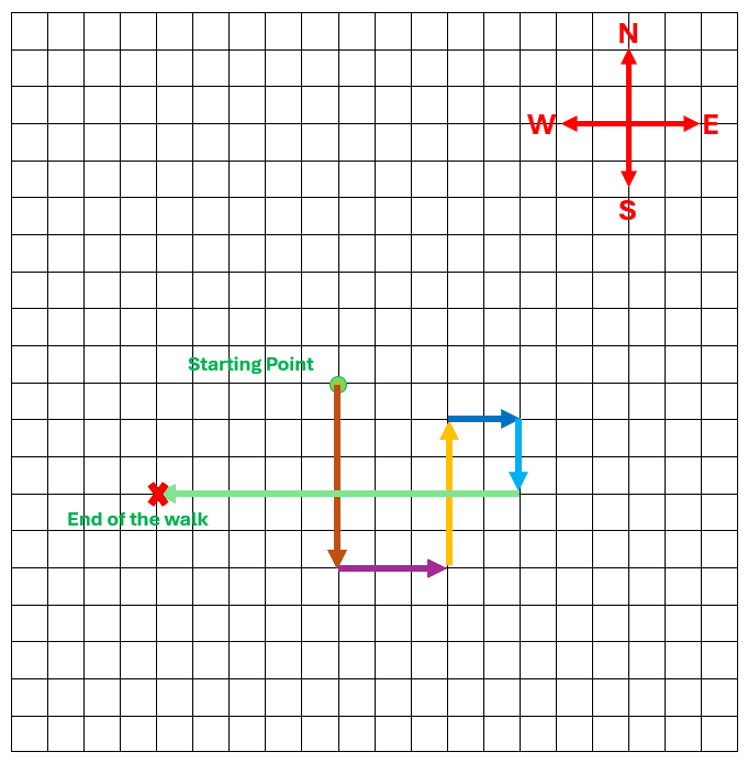 What would happen if you did this walk in a different order using the same instruction cards? For example, you start with the third instruction (4 steps North), then take the fifth instruction (2 steps South) and so on until you have followed all the instructions.