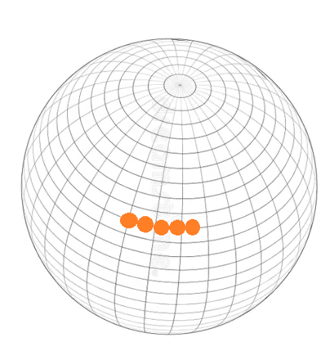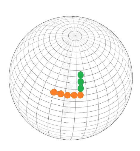 So if we follow the instruction ‘five steps to the east’, it would look like this on the sphere: