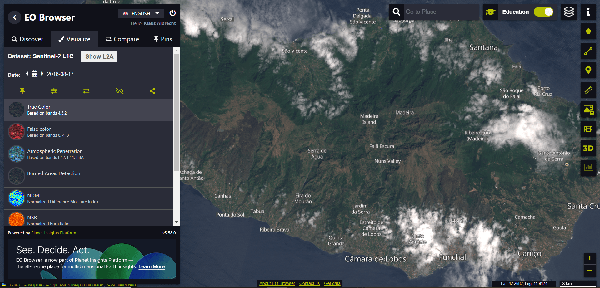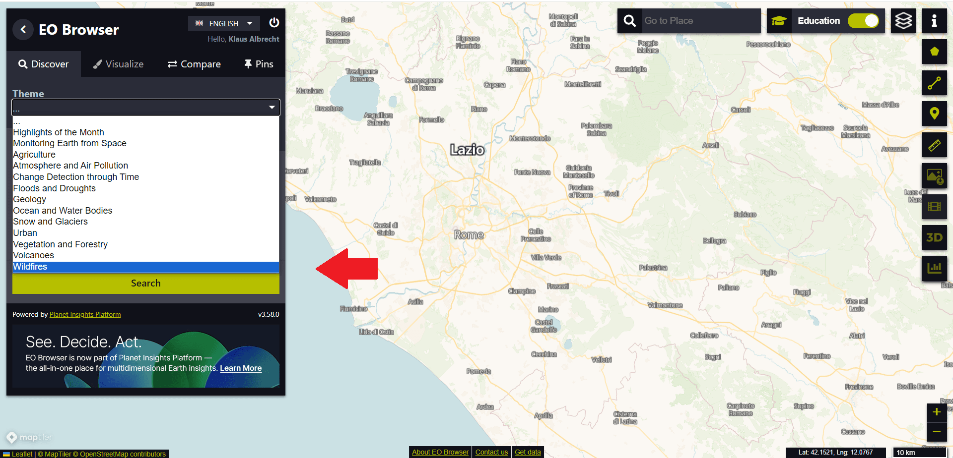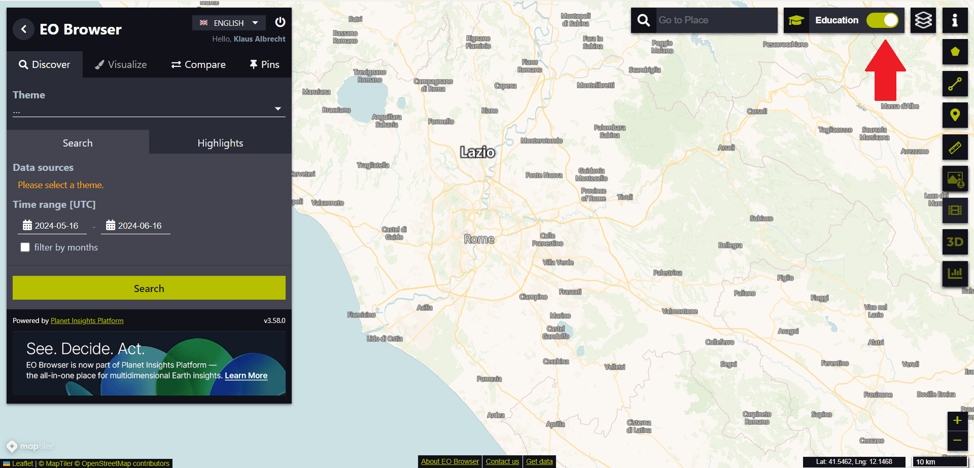 For the first exercise with the EO Browser, we want to switch to Educational mode (see red arrow in the top right corner of the following image):