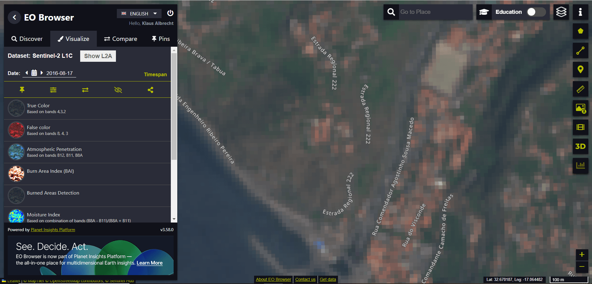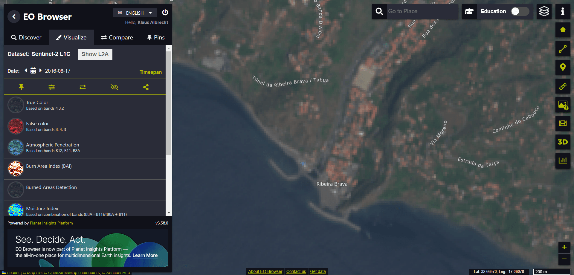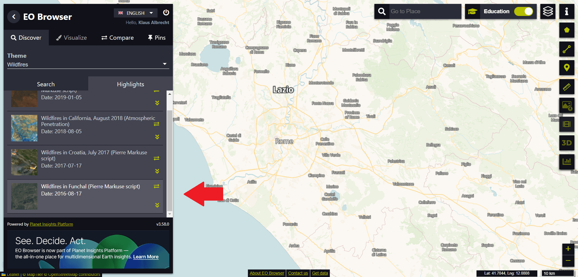 From the suggested “Highlights” we select the entry “Wildfires in Funchal (Date: 2016-08-17)” at the end of the list.