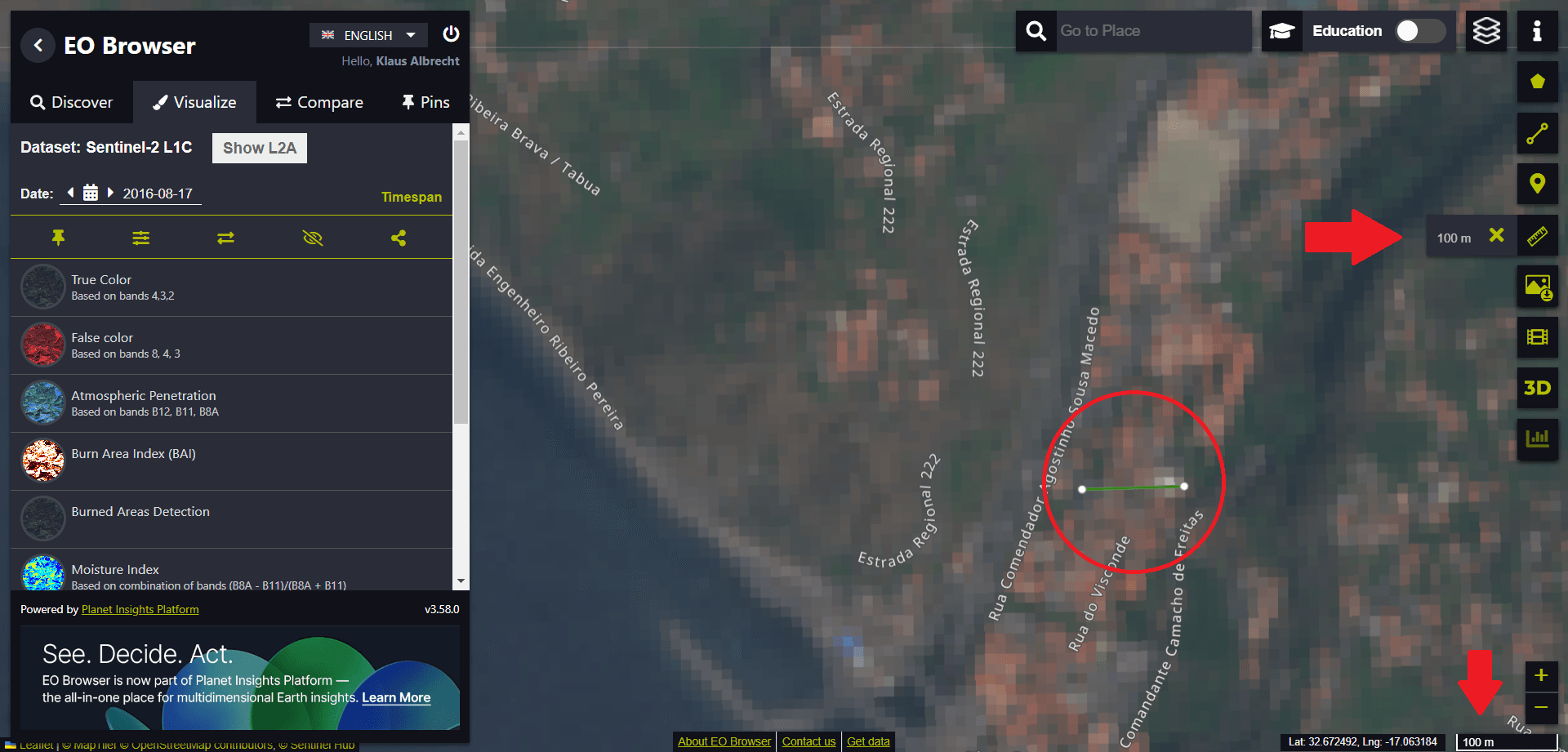 Due to the available spatial resolution, it is not possible to separate individual buildings from one another. Using the measuring tool on the right-hand side of the screen (see red arrow in the image), we want to measure the distance covered by 10 individual pixel points in the image.