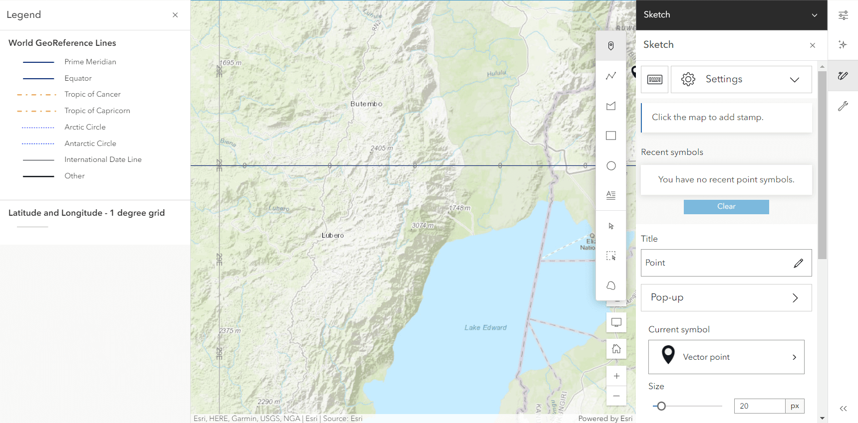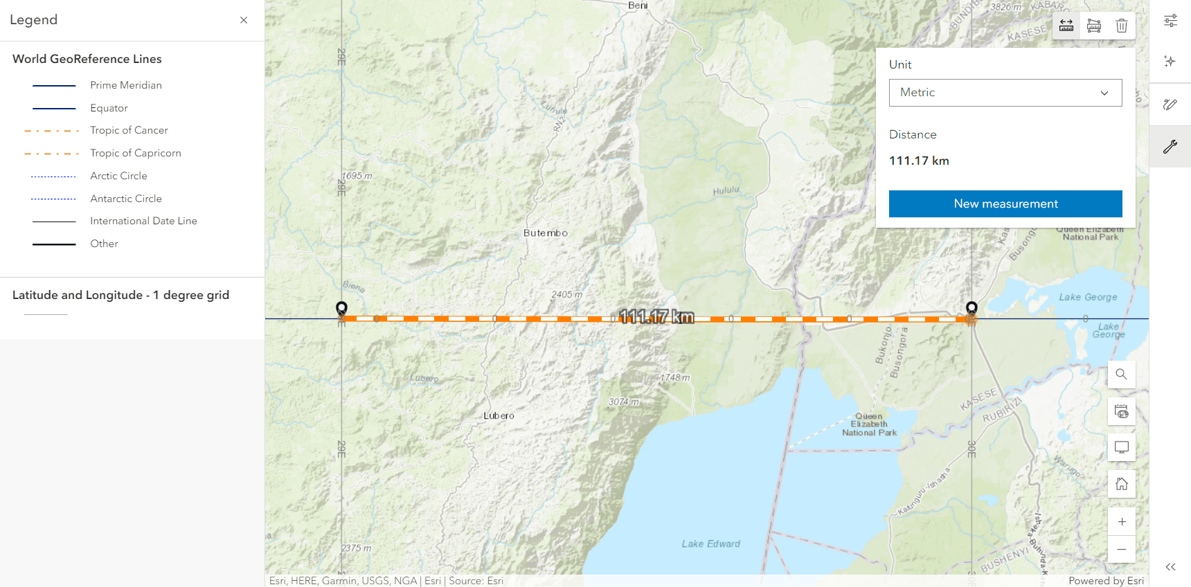 We now zoom in very close to the equator to find the distance between two points with a 1° difference in longitude.