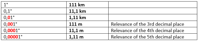 This makes it possible to determine the effect of an additional decimal place for determining the position (for a distance at the equator of longitude).