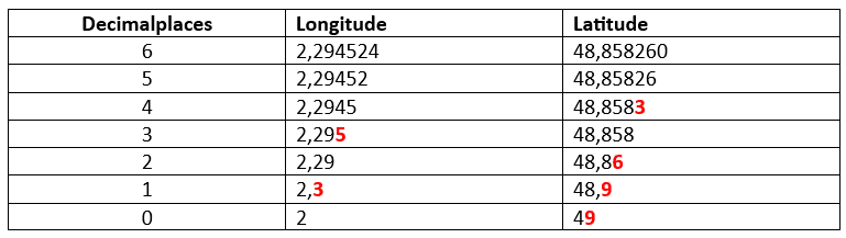The following graphic shows us where we end up when someone tells us the position of the Eiffel Tower – and always simply omits more and more decimal places for the longitude and latitude.
